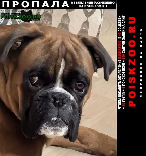 26.11.2018г. в 17 часов НАЙДЕН молодой кобель породы Немецкий Боксёр в районе автобусной остановки "Щербинки-2". Возраст собаки, ориентировочно, 1,5 - 2 года. Окрас р с рыжий с характерной маской и белыми отметинами. Видимых проблем со здоровьем нет, зубы все. Звонить по тел. - Николай #дд_найдена_собака