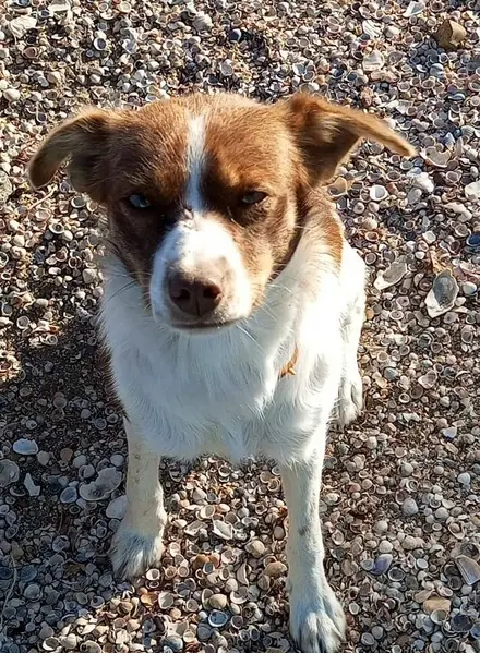 Нашли на ул. Тимирязева в подъезде дома. Ощущения, что была чья-то, потому что удалены ногти с мезинцев. Отвезли в собачий отель, где ей сделали прививку от бешенства, дали таблетку от глистов, обработали от блох и клещей. Хотели отдать в приют, но рука не поворачивается. Приблизительный возвраст - 3 года. Характер у собаки добрый, ласковый, знает команду "гулять", на прогулке ходит только рядом, пока что всего боится. Оставили бы себе, но такой возможности нет. Пятна на пузе, гуляя всегда ходит рядом. Защищает свою территорию