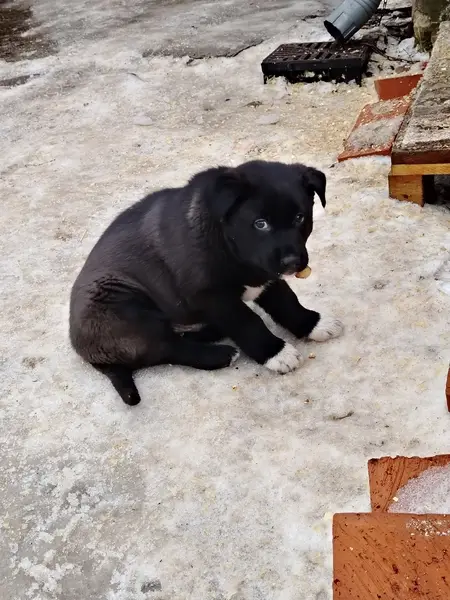 Пёс очень красивый . На вид ему месяца 4. Игривый и добрый . Белые туфельки на лапках и белое пятно на носике . Пришёл сам к офису и не уходит неделю.