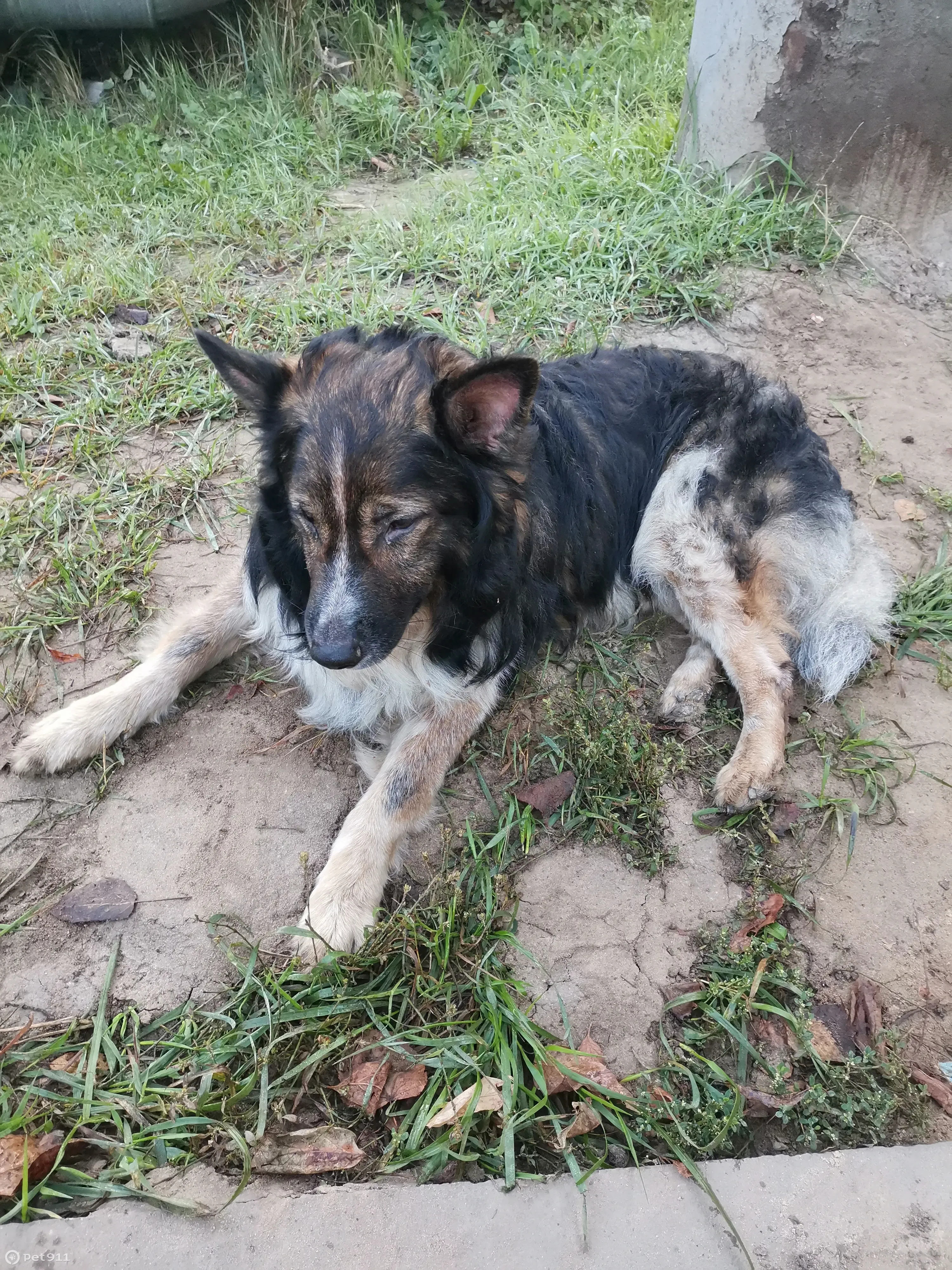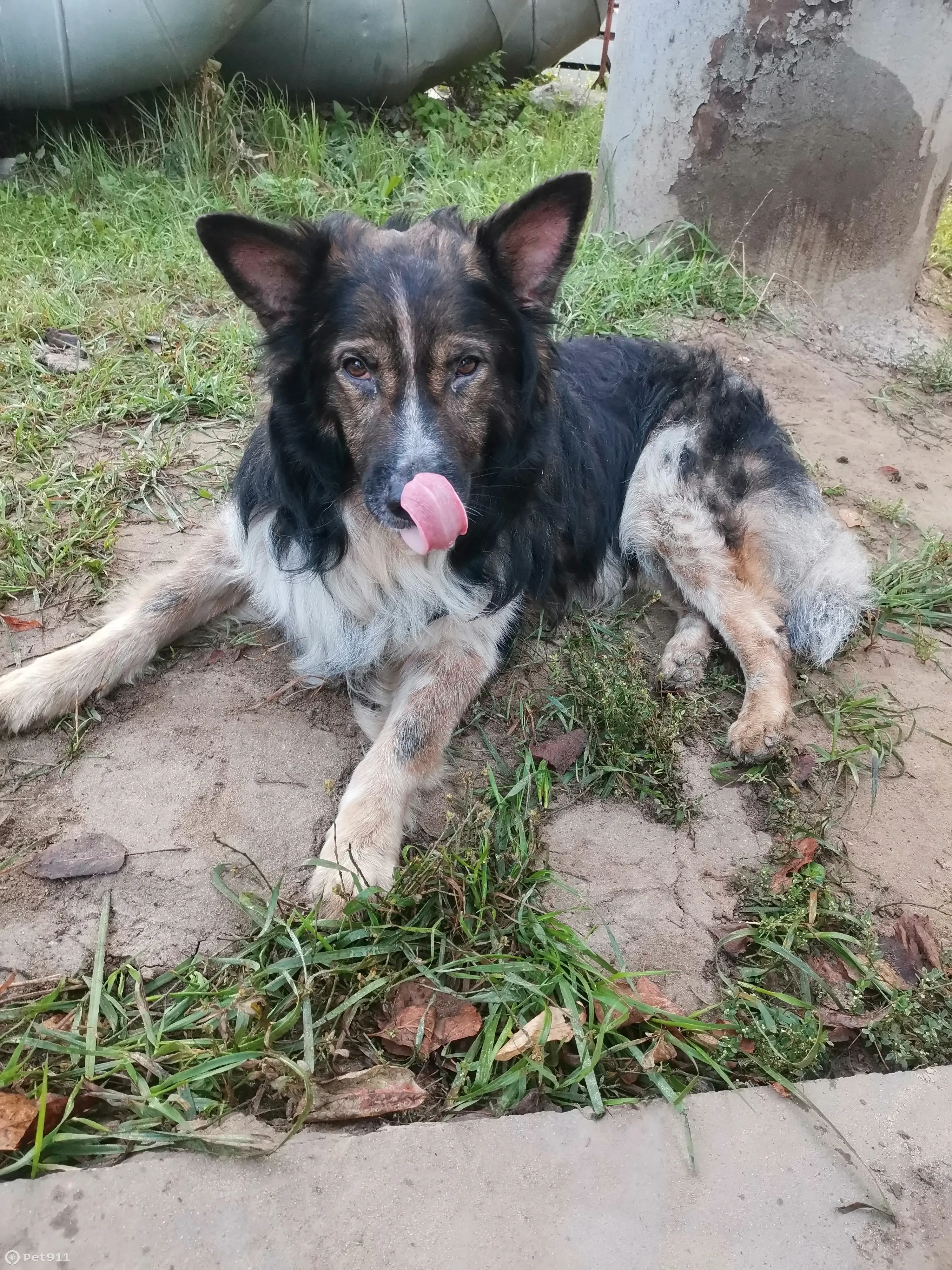 с ошейником, не знаю породу, лежал на дороге, наверное долго бегал и не пил давно, бессилен, добрый, умный, бывший домашний, на контакт идет, команду место знает, с поводком гуляет, тихий ласковый.