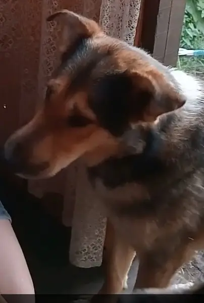 Молодой, спокойный, не кастрирован. Ошейник с карабином. Черно-рыжий. Крупный, метит овчарки. Кончики ушей висят.