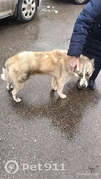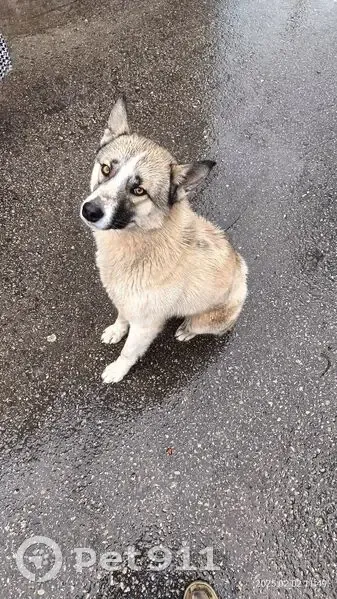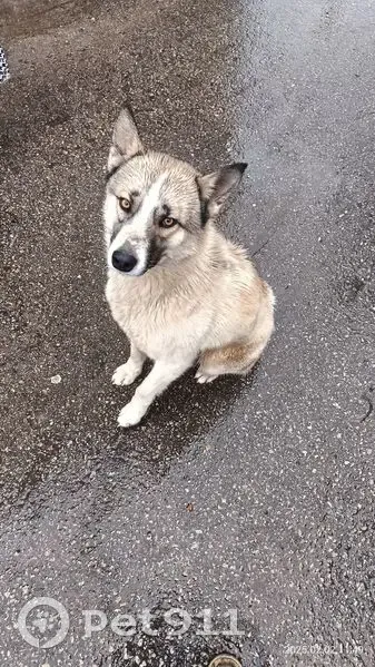 Найдена собака, уже несколько дней сидит у подъезда, неагрессивная, подходит, дается погладить, ошейника нет, но по виду домашний.Пол, порода мне неизвестна.
