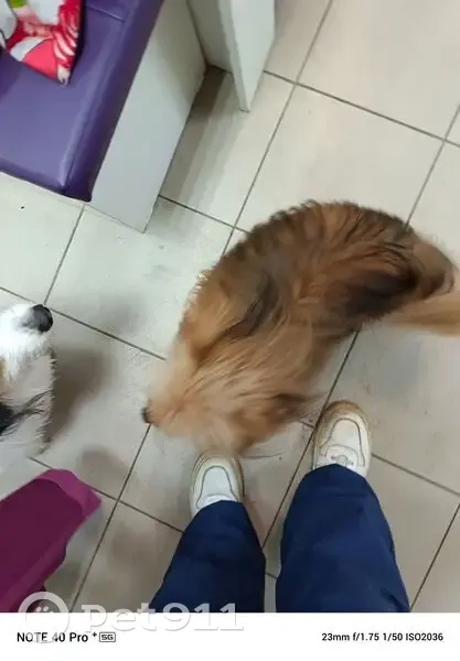 Рыжий Мальчик с черными вкраплениями на спинке, похож на шпица, судя по зубам не особо молоденький. Не кастрированный, побежал за мной и моим кастрированным питомцем. Чувствуется, любвиобильный. Знает команды и не лает, явно воспитанный. К сожалению, черный ошейник без имени и номера хозяина.