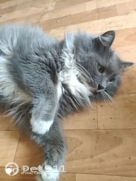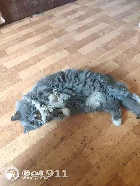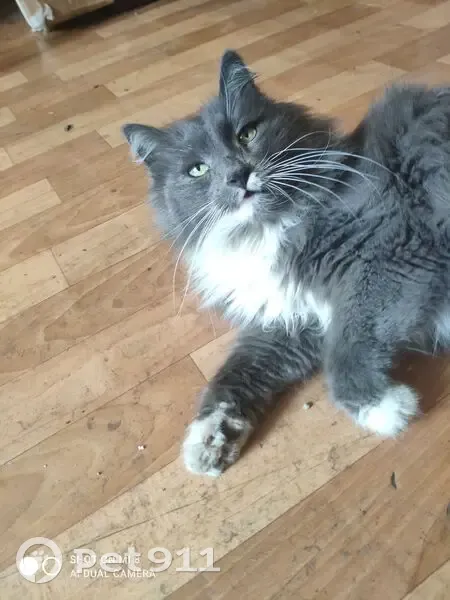 Крупный взрослый, дымчато- серый, низ лапок все белые, грудка белая, откликается на имя Тишка, ошейник с медальоном, на медальоне написано Тихон и номер телефона