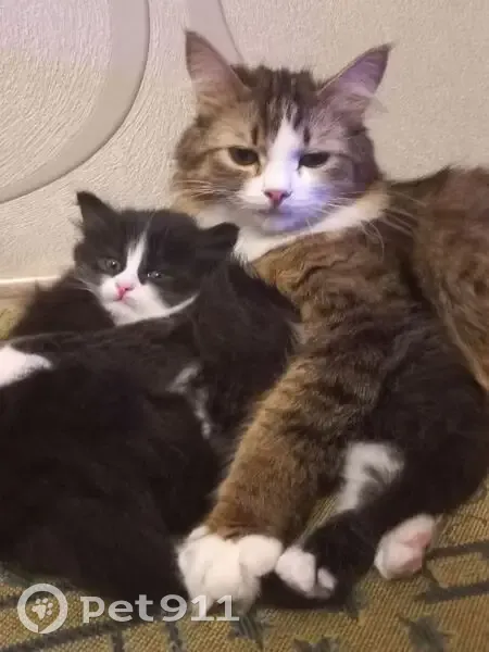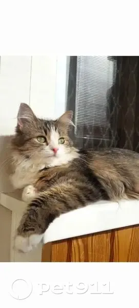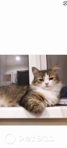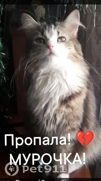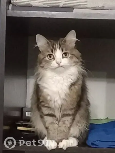 Пушистая серокоричневая с белым, есть полосочки яркие , у носика белая, шерстка, на шее белое жабо, на лапках белые пинеточки. Пропала у 2-го подъезда 31августа
