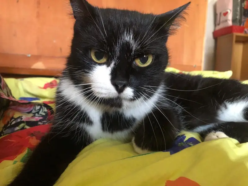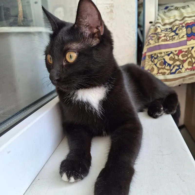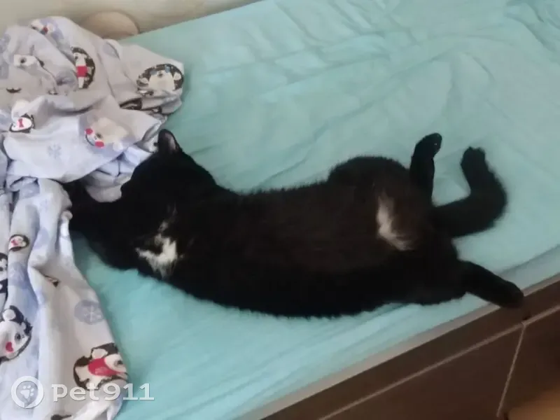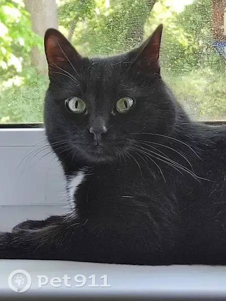 Кот полностью черный, с белым пятнышком на шее и пузике. Крупный, 4,5-4,7 кг. 10 лет. Кастрированный, домашний, улицы не знает, пугливый. Выехал на улицу в детской коляске, не заметили его, а там сиганул куда глаза глядят.
