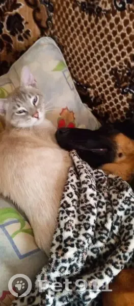 Молодой котик светло серого окраса,метис тайской кошки.Глаза голубые с небольшим косоглазием.Передние лапки с врождённой особенностью нет четких подушечек и некоторых пальцев.