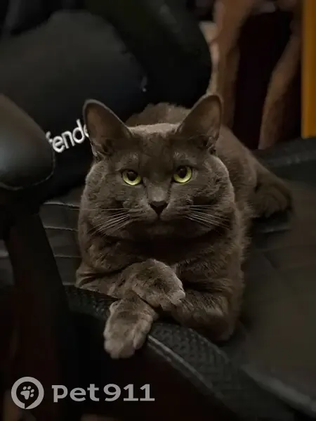 Дымчатый окрас, на животе есть белые пятна. Желтые глаза . Очень пугливый