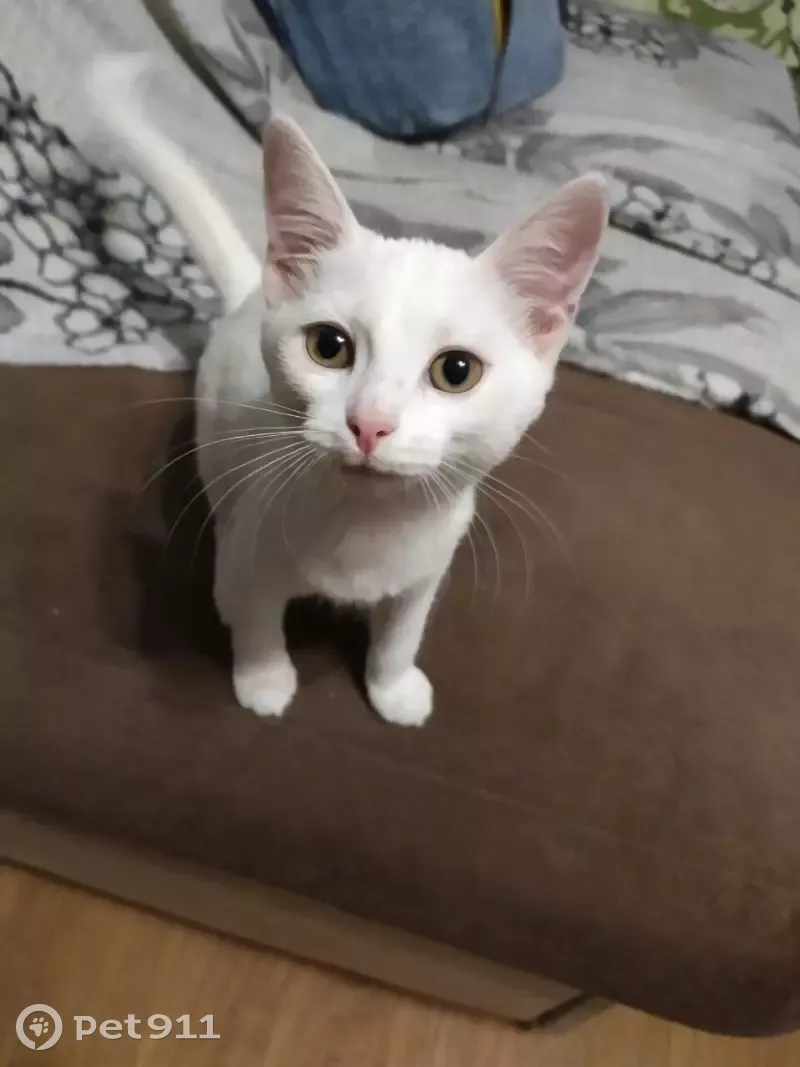Кошечка Стёпа, миниатюрная и пугливая. 2 года. Шерстка белая без пятен -короткая. глаза жёлто-зелёные. Прыгнула за мухой с балкона второго этажа. На придомовой территории гуляет много собак, она испугалась и убежала.