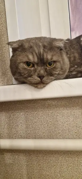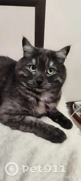 Окрас серо-черный с белым подшерстком. Домашний,на улицу не выходит,пугливый.Вышел в подъезд и исчез. Кастрированный,страдает мочекаменной болезнью,питается лечебным кормом.