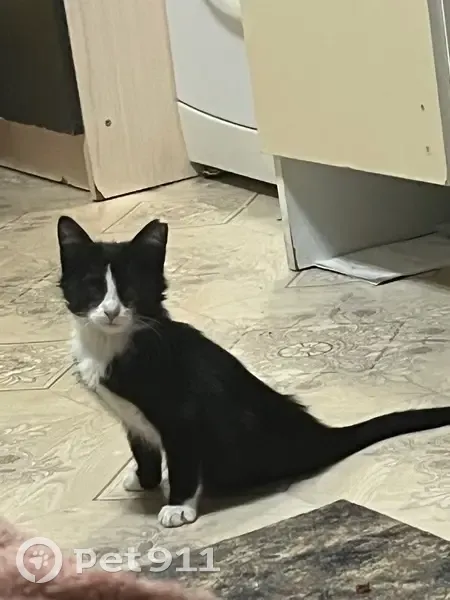 Черно-белый котенок с зелеными глазками. Мордочка и грудинка беленькие, так же имеются белые носочки на лапках. Кусочек правого ушка отсутствует. Котенок выпал из окна вместе с маскитной сеткой с 5-го этажа.