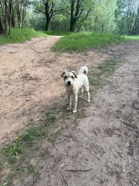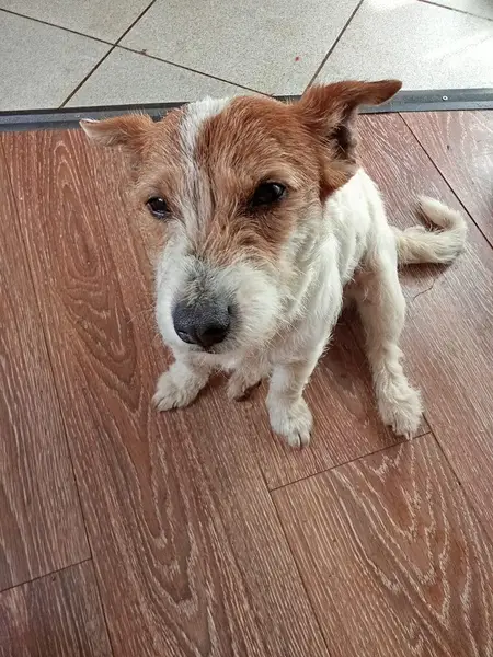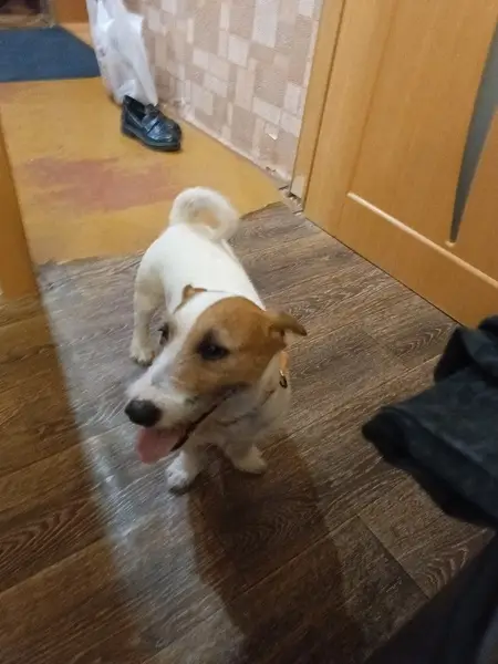 Джек рассел терьер.Валсу 1,5 года, белый с рыжими пятнами. На носу проплешины от болячки. На нем кожаный коричневый ошейник. Он может быть травмирован, тк его задела машина, когда он перебегал через дорогу. Бежал в сторону чернышевского