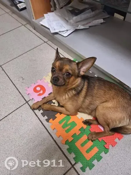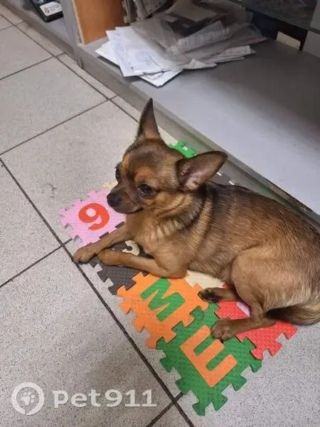 Чих. Раскормленный. Мальчик. Есть седина на мордочка. На спине чёрная полоса. Сам рыжий. 4 года. Потерялся, когда детей отводила в школу. Без ошейника и поводка. Кличка Тошка.