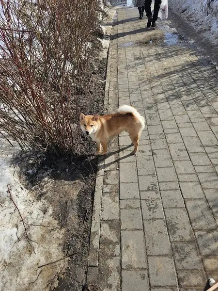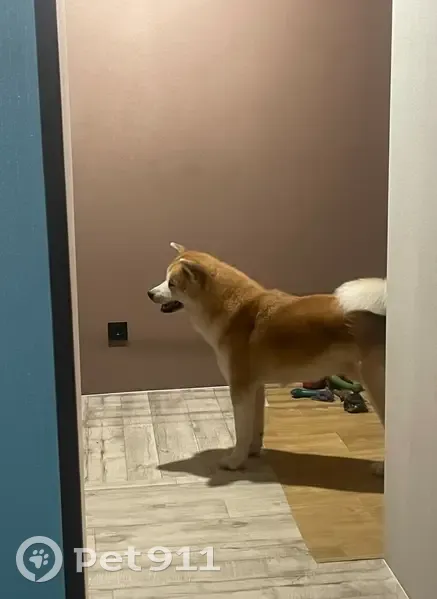 Акита - Ину, окрас рыжий, 4 года. Был в яркой шлейке салатового цвета.