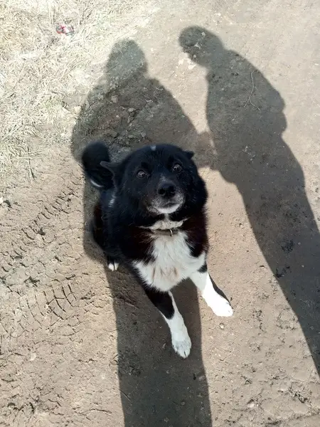 Черный, лапки белые. Слепой. Ошейник. Дружелюбный, легко идет на контакт.