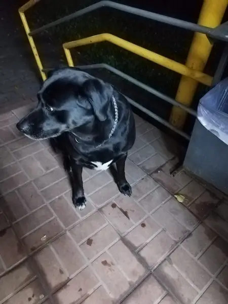 Сука, черная с белым пятном грудке, в строгом ошейнике. Пришла в подъезд по ул. Березовская 96. ...