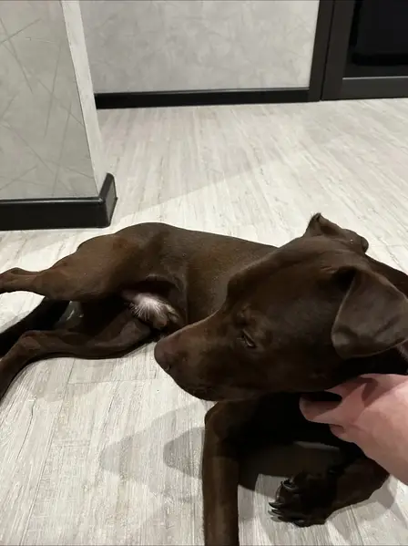 Пропала собака лабрадор. Девочка. Возраст 8 лет. С клеймом. Цвет шоколад. В районе Гаугеля. Просьба кто найдет придержать. Тел для связи анастасия. На фото где вдвоем та которая привязана.