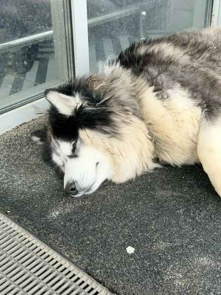 Сибирский хаски, кобель, окрас чёрно-белый, на носу много черных пятнышек, дышит тяжело и шумно из-за врождённого порока связок, не лает. Убежал.