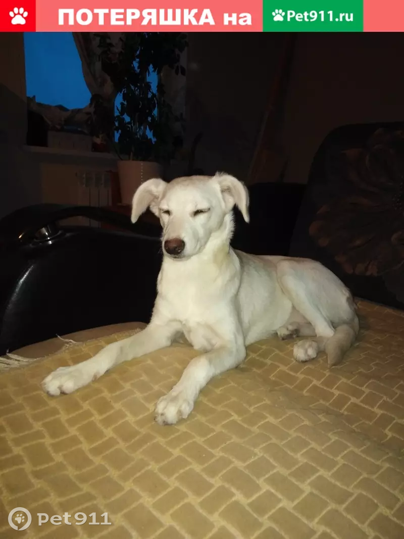 Девочка белый окрас, возраст 6 месяцев, длинные лапы дворняга. Зовут Луна, убежала во время прогулки. На шее коричневый кожаный ошейник. Поводок рулетка.