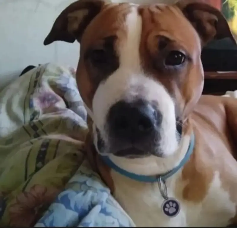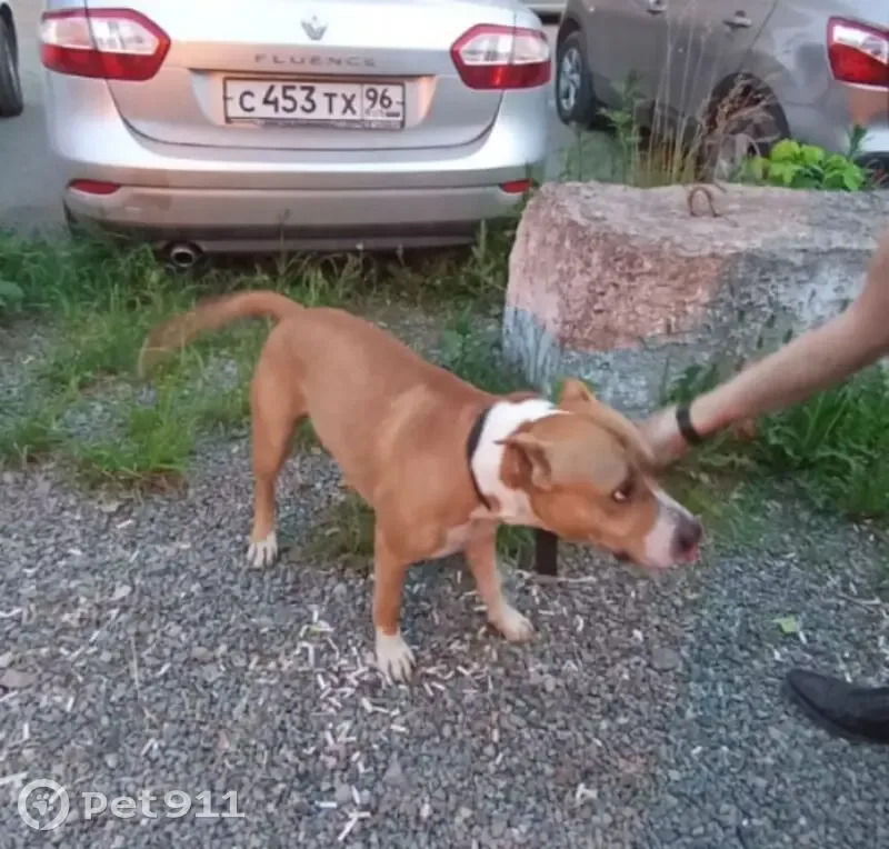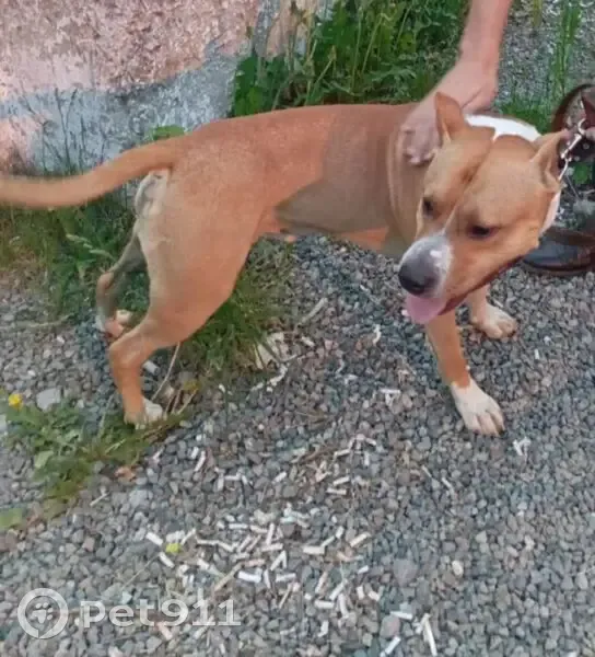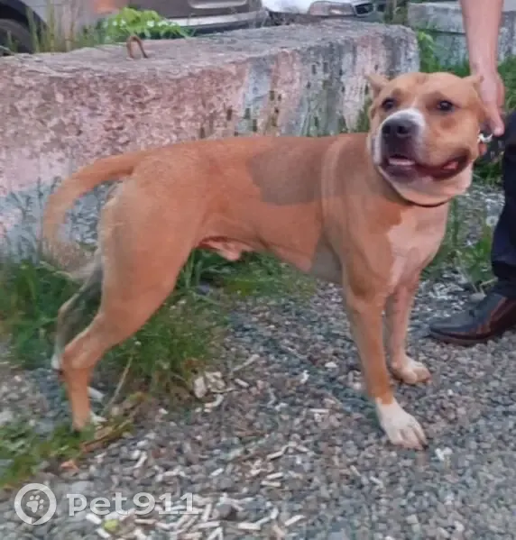 Мальчик породы Стаффорд рыжего окраса, вокруг шеи шерсть белого цвета, вокруг носа белое пятно. Пёс увязался за незнакомым мужчиной, тот купил ему ошейник и поводок и привязал во дворе. Собака скулит не переставая, мечется, ищет хозяев.