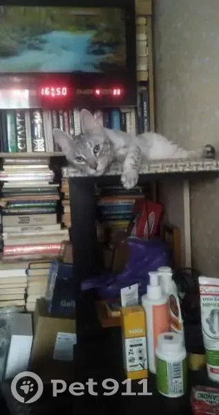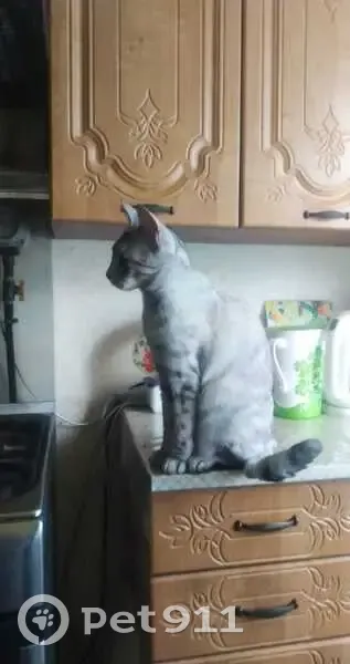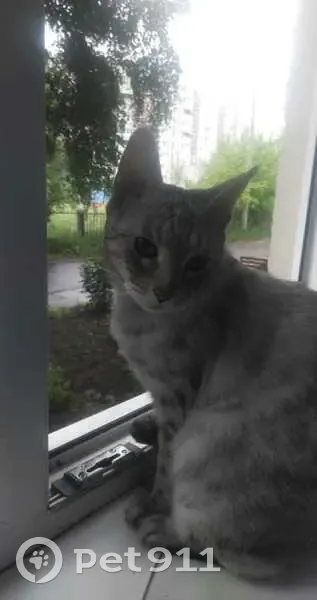 серая с темно-серыми полосками и пятнышками, желтые глаза,на имя не отзывается, ласковая и доверчивая,но немного пугливая. Выпрыгнула с окна,когда отвлеклись. Телефон: +7 950 659-80-05