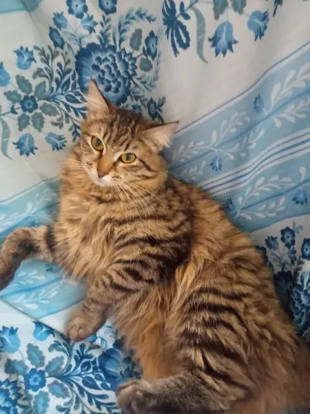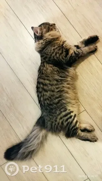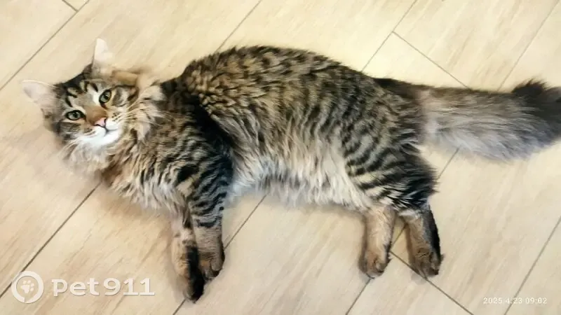 Окрас камышовый (серый, черный, белый, рыжий), вокруг шеи "жабо" из меха, хвост очень пушистый, на конце черная кисточка. На шее был черный ошейник со светоотражающей полосой, бубенчиком и мелким брелоком