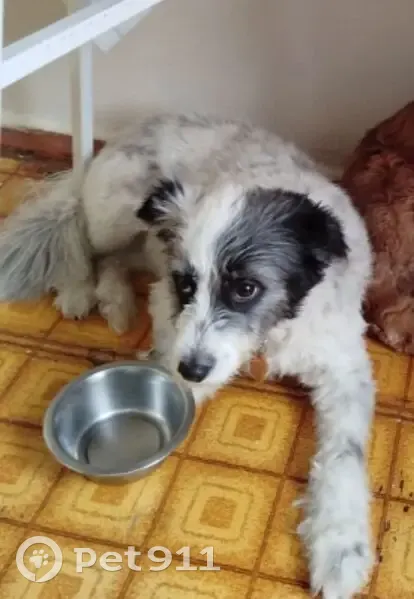 Собака среднего роста белого цвета с черными пятнами. На голове эти пятна ярче выражены и гораздо больше, чем на теле. Она одета в розовый свитер с белыми сердечками, поверх надета серая шлейка. Есть ошейник красного цвета, на котором висит оранжевый жетон с номерами хозяев. Собака достаточно пугливая, но к людям может подойти попросить покушать или погладить ее, встав на задние лапки, а передние оставить свисать перед грудной клеткой. В новогоднюю ночь очень испугалась фейерверков и быстро убежала от двери подъезда, не дождавшись, когда ей откроют дверь. В районе показывали ее фото, спрашивали, но пока что никто не видел.