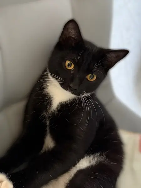 Внимание! Ногинск! По адресу ул. Гаражная д. 1, в одном из подъездов найден кот. По виду- домашний,ухоженный, с ошейником, окрас чёрный с белым,желтые глаза. Скорее всего, кот не из этого дома, а из ближайших или из частного сектора, т.к.до того как попасть в подъезд, грелся в Пятерочке. Кто узнал потеряшку, просьба обращаться по тел. Сейчас кот на временной передержке, постоянно оставить нет возможности.