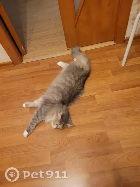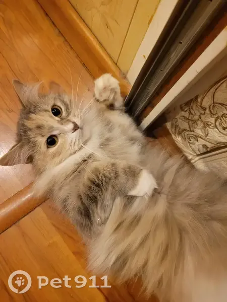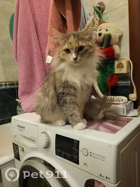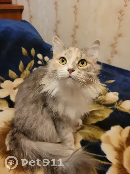 Трехцветная, светло серенькая с белыми и не яркими рыжими пятнышками, шерсть длинная. Боится людей, собак, других кошек, т. К. Всегда была дома и на улицу не выходила никогда