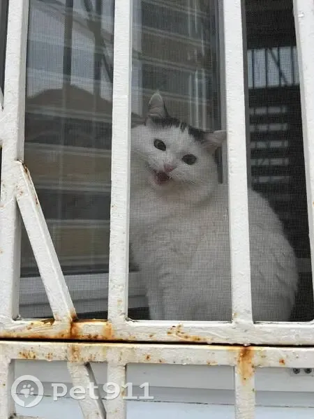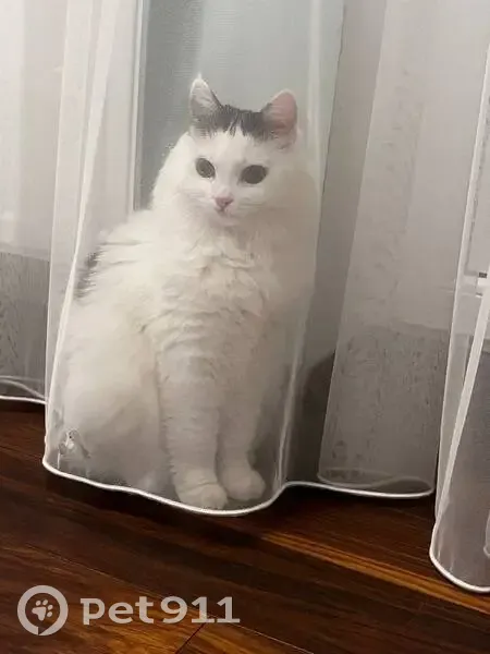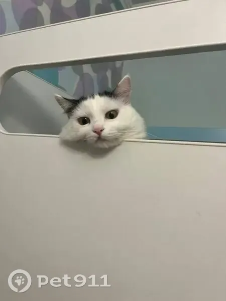 белая кошка с черным пятном на голове и туловище. Черный хвост. Желто-зеленые глаза,ближе к болотному цвету. Без ошейника. Разговорчивая,громко мяукает и мурлычет. Может испугаться,и начать царапаться,но быстро успокоиться. Гладиться дается не всем. Раньше жила на улице,до того как ее нашли в подвале. Выпрыгнула из окна,убежала в неизвестном направлении.