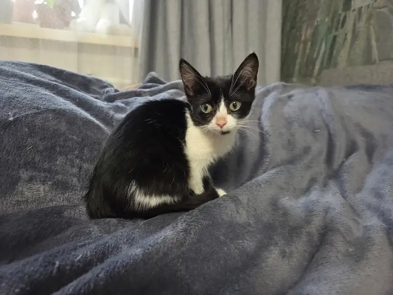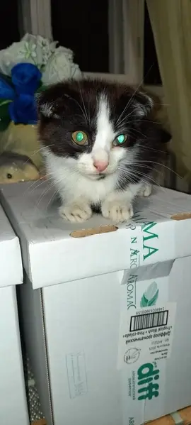 Окрас черно-белый, очень милая и пугливая. Пропала, испугавшись собаку на новом месте у новых хозяев.