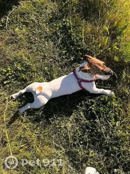 Щенок Джек Рассела терьера,была в синем ошейнике. К людям отзывчива но при этом не знает улицы Отметины только на хвостике и масочка на морде,корпус белый Есть особенности по здоровью