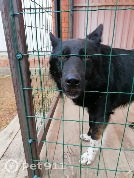 Найдена собака, черная с белыми лапками, до колена, пол неизвестен, добрая, ухоженная, видно что была домашней, бегает тут со среды, пока придержали, ищем старых или новых хозяев