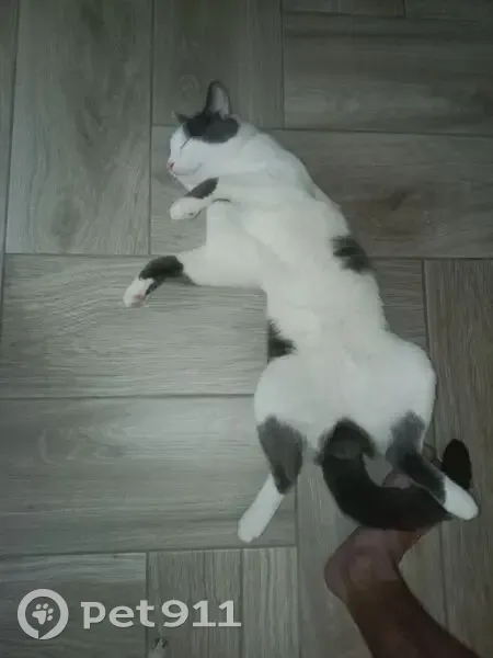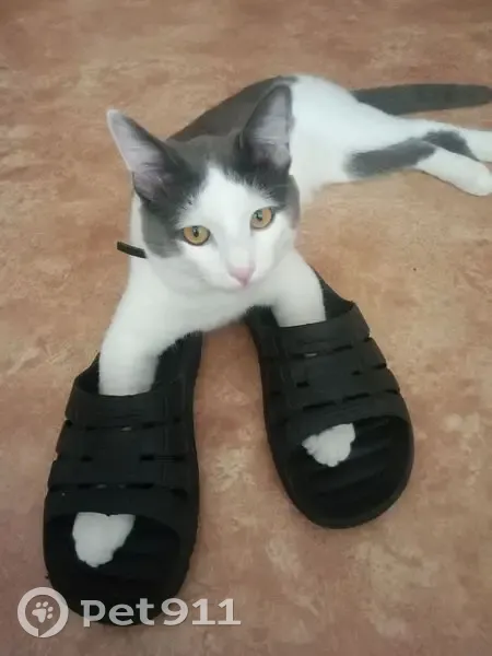 Бело-серый окрас, на каждой из лап по серому пятнышек. Глаза жёлтые. Несовсеми идёт на контакт, детей не любит, спокойный. Ушел гулять по расписанию, домой не вернулся.