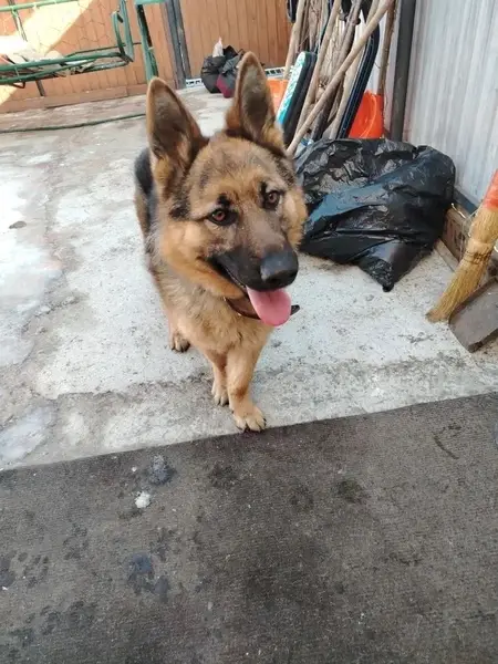 Немецкая овчарка по кличке ГРОС. Он не кастрирован, видимо началось обострение и он сбежал с участка. Особых черт нет, просто обычная немецкая овчарка