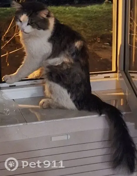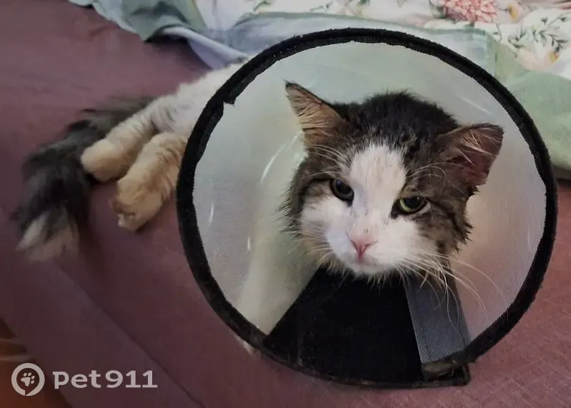 Кот проходил лечение, на левой щеке большая рана ещё не до конца затянувшаяся. Щёчка побрита, пол спины побрито, так как срезали колтуны. Кот большой 5,300 кг, длинный. Белые лапы и живот, серая полосатая спина, длинный черный хвост. Особенности: на спине ровно в центре белое пятно и бубенчики каким-то образом камышевого цвета. Был на частной территории, уже 5й день его нет, обычно так долго он не пропадет на улице.