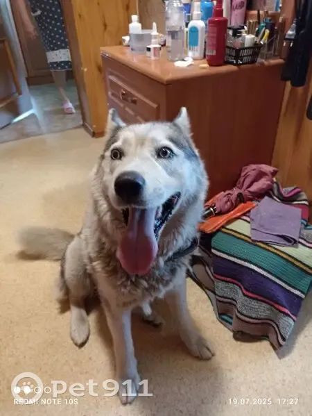 Хаски, голубые глаза, с ошейником. Бродила в...