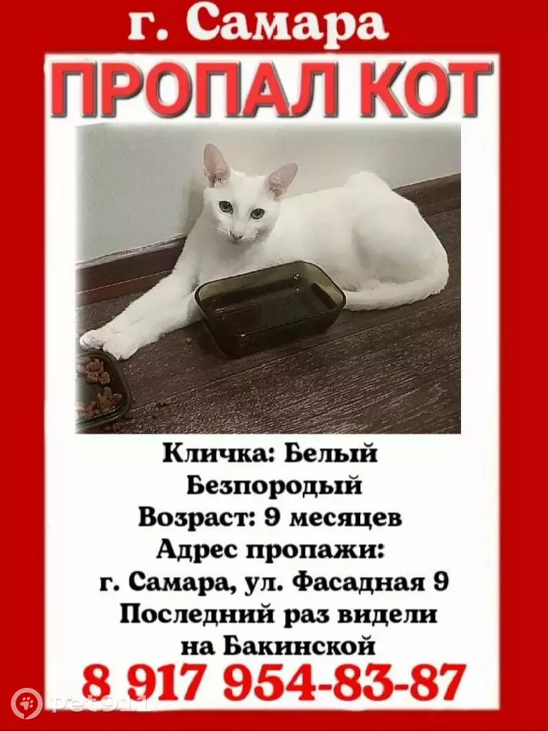 Потерянные животные Самара, фото: Пропала кошка Белый по адресу Фасадная улица, 9, Самара