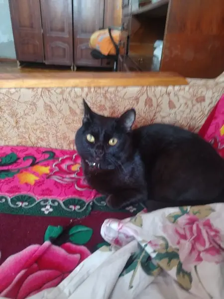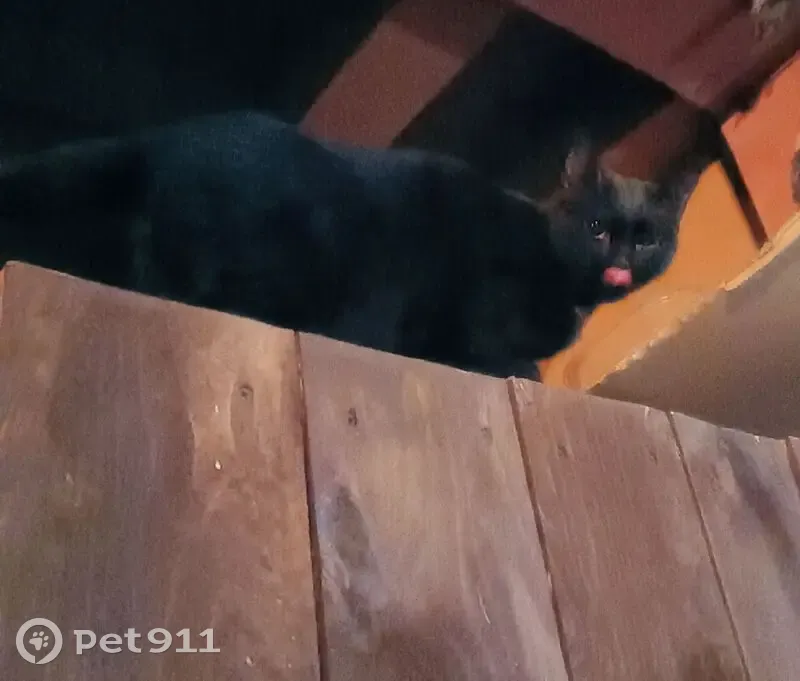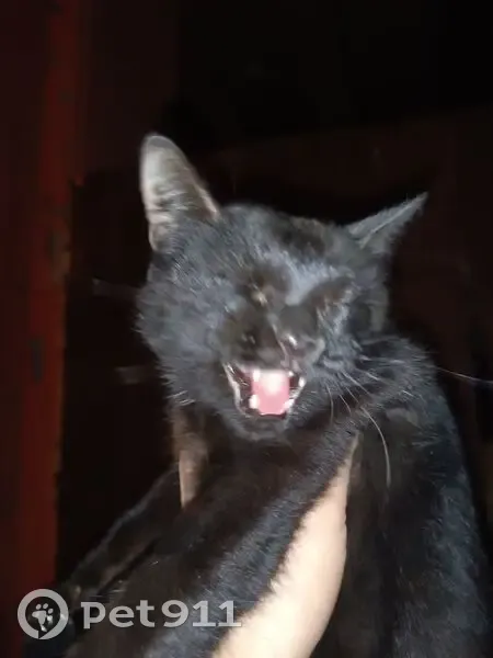 Нашли кошку. Чёрная (бурая) кошка, упитанная, молодая судя по размерам. Мяукала много, домашняя, была напугана скорее всего. Спереди ниже подбородка белая полосочка