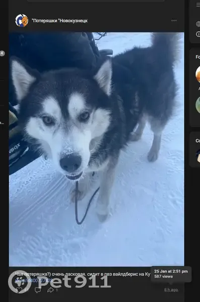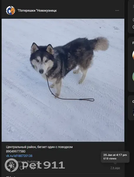 Хаски, карие глаза, есть место без шерсти на боку, возможно со шрамиком от прививки. Мальчик. Нашли возле пекарни "Жар свежар" на Проспекте Строителей, 47/9. Есть что-то наподобие короткого ошейника в виде коричневой круглой веревки.