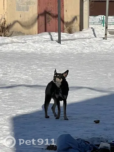 Собака небольшого размера, темный окрас, светлые бровки. С ошейником. Вроде мальчик. Людей боится, при приближении уходит в сторону, лает. Лежит уже несколько дней во дворе в районе комсомольской площадки.