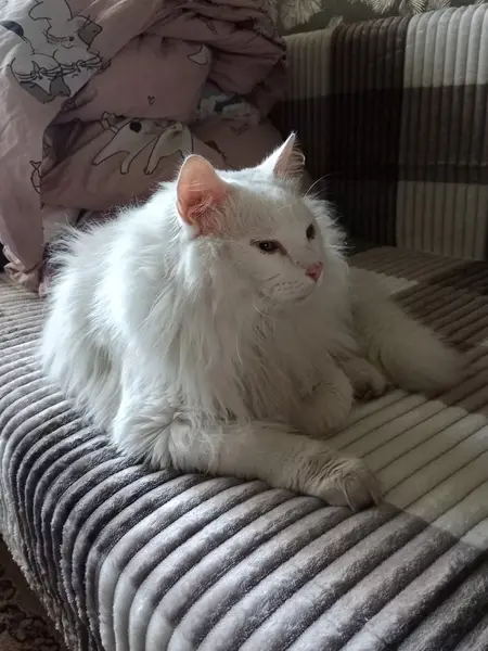 Девочка. Полность белая, глухая. Шерсть немного в колтунах и свалявшеяся. Пугливая. Кошечка старая.