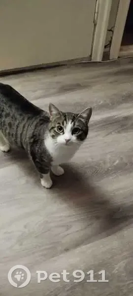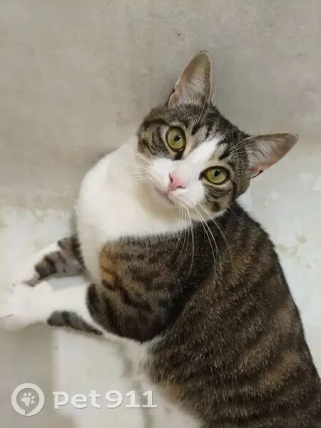 Белый низ: лапки, животик. Темно полосатый верх. Ярко желтые глаза. На подушечках черные отметки полу розовые полу черные. Упал с балкона, просидел в кустах около трех часов, далее скрылся в неизвестном направлении, возможно в подвале дома