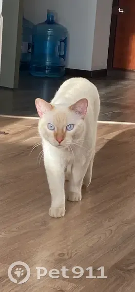 Белый взрослый кот, хвост в рыжую полоску, нос и кончики ушек рыжие, глаза голубые, весит примерно 5 кг, очень пугливый, так как кот домашний и не знает улицу