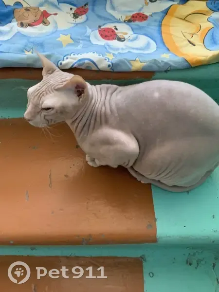 Лысая кошка, взрослая, бросается во все открывающиеся квартиры. На спине шрам как от царапины