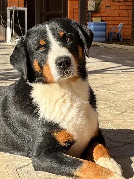 Черная с белым, потеряшка, сидит во дворе и преданно ждет хозяина четвертый день уже, к себе не подпускает