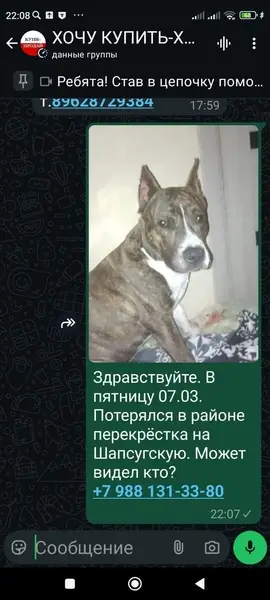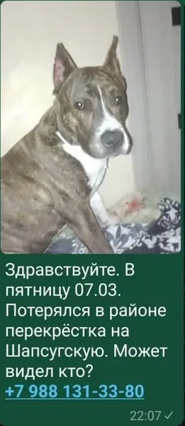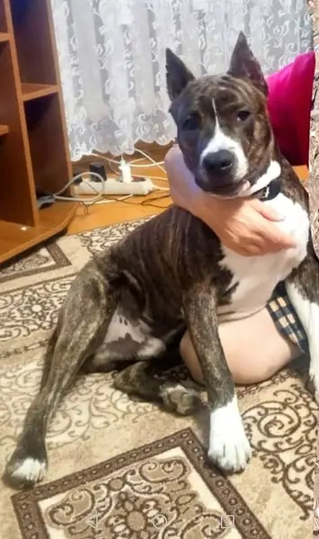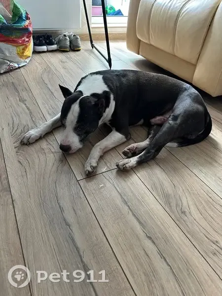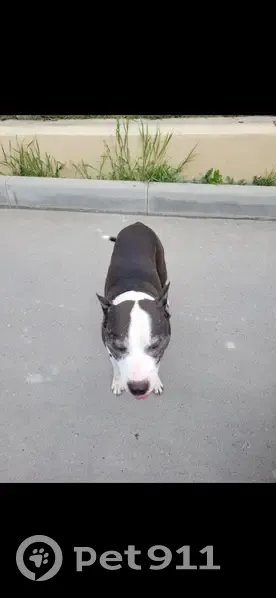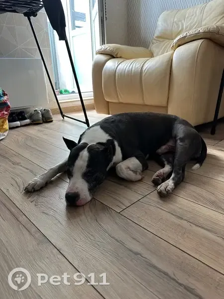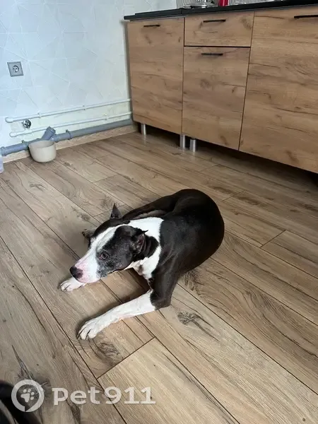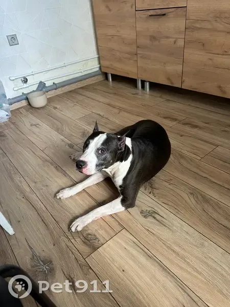 Черно белый Стаффорд,сидела возле 11 школы(район южный),мальчик,возраст не знаю,очень добрый ласковый послушный,есть немного раны,лапы содраны,видно,что устал,не первый день на улице