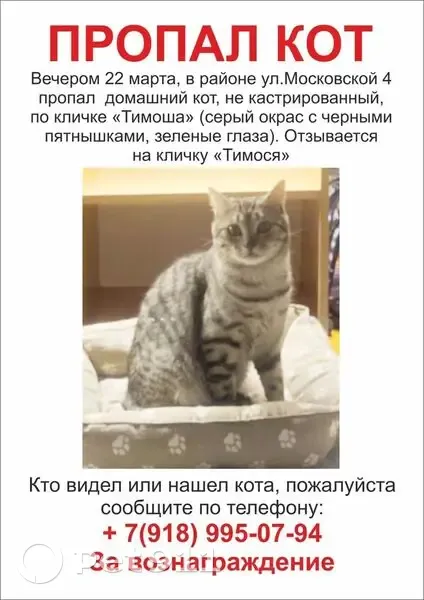 Кот домашний. Тимоша. Чаще откликается на ТИМОСЯ. СЕРЫЙ в съёмными полосками очень похож с картинки китекат. С самого рождения на улице никогда не был. Не кастрирован.