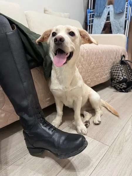 Порода лабрадор, сучка, с красным ошейником, кличка Акелла