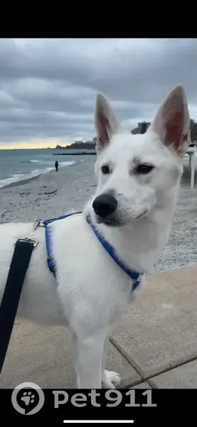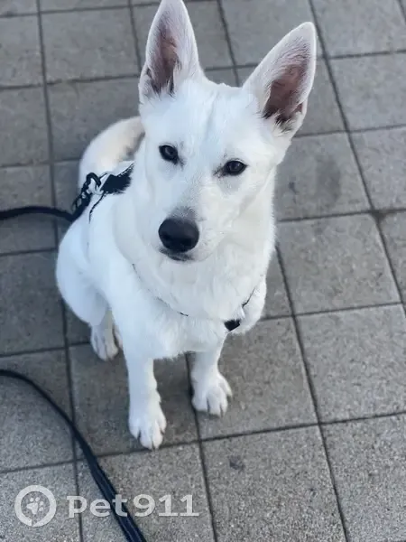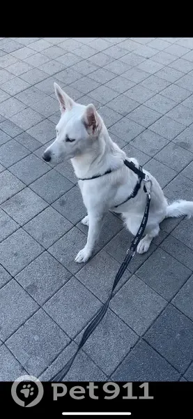 Девочка, белая, на спине и шерсть уходит в бежевый, прямые уши, карие глаза, нос черный к центру светлее. Боится всего, кроме людей. Добрая, игривая. Зовут Ви, на ней черная шлейка фирмы Staya